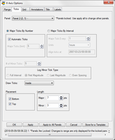 • Set All Panels: This button works individually for each tab. Any operations done on a given tab after setting the button will propagate to all panels. Behavior with Locked X-Axes on the X-Axis only: When Locked X-Axes in Plot/Layout Options is checked [the default], the GUI will check Set All Panels for the Range, Ticks, and Grid tabs, while unchecking Set All Panels for the Annotation and Labels tabs. We recommend that the user keeps these settings for the Annotation and Labels tabs when axes are locked.