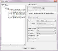 The suggested workflow for this dialog is to first use the tree widget in the "Loaded Data" pane to select some subset of the currently loaded variables, then use the controls on the right hand side to select a file format, an optional time range, and any additional style settings (if ASCII format is selected). Clicking the "Save" button will perform a few checks on the selected data variables, and if the selection is valid, the GUI will pop up a file picker dialog to specify the filename and directory to save.