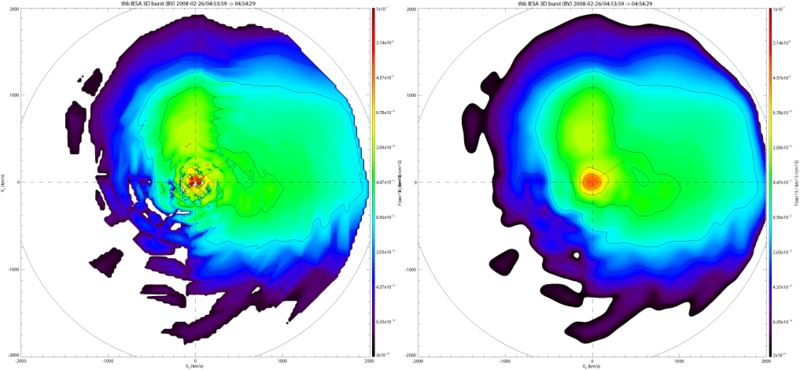 Distribution slice of ESA ion burst data using 3D interpolation. Left plot has no smoothing, right plot has default 7 pt smoothing window applied (both use default 150pt plot resolution).