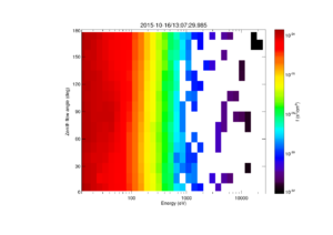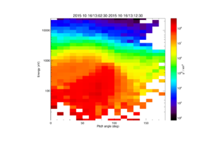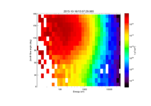 <syntaxhighlight lang="idl"> MMS> mms_part_getspec, instrument='fpi', probe='1', species='e', data_rate='brst', level='l2', outputs=['energy', 'pa'], trange=['2015-10-16/13:02:30', '2015-10-16/13:07:30']