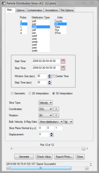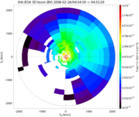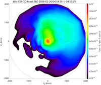 THEMIS particle distribution slices plot a two dimensional slices of ESA and/or SST particle data against velocity or energy. Slices are produced after selecting a data type, time window, slice orientation, and z axis units. All samples within the time window are averaged together then the slice is extracted via one of the methods listed below. Slices may be oriented using predefined coordinates or manually.